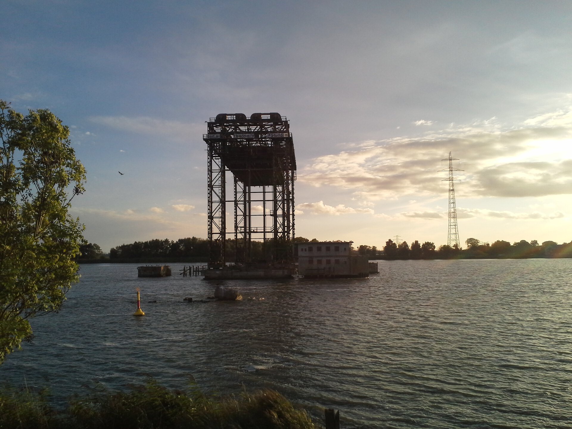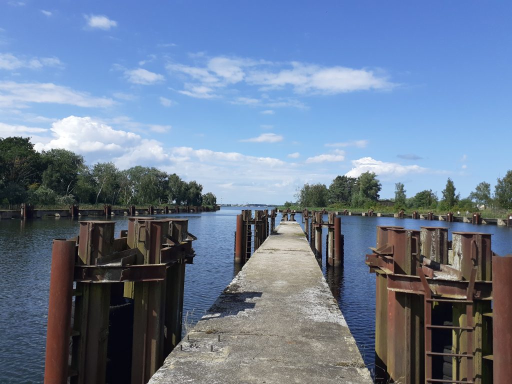 Später Halt in Karnin. Von der einst 360 Meter langen Bahnbrücke zwischen dem Festland und der Insel Usedom blieb das Mittelteil, die Eisenbahn-Hubbrücke erhalten. Anschließend Rückfahrt über Berlin.