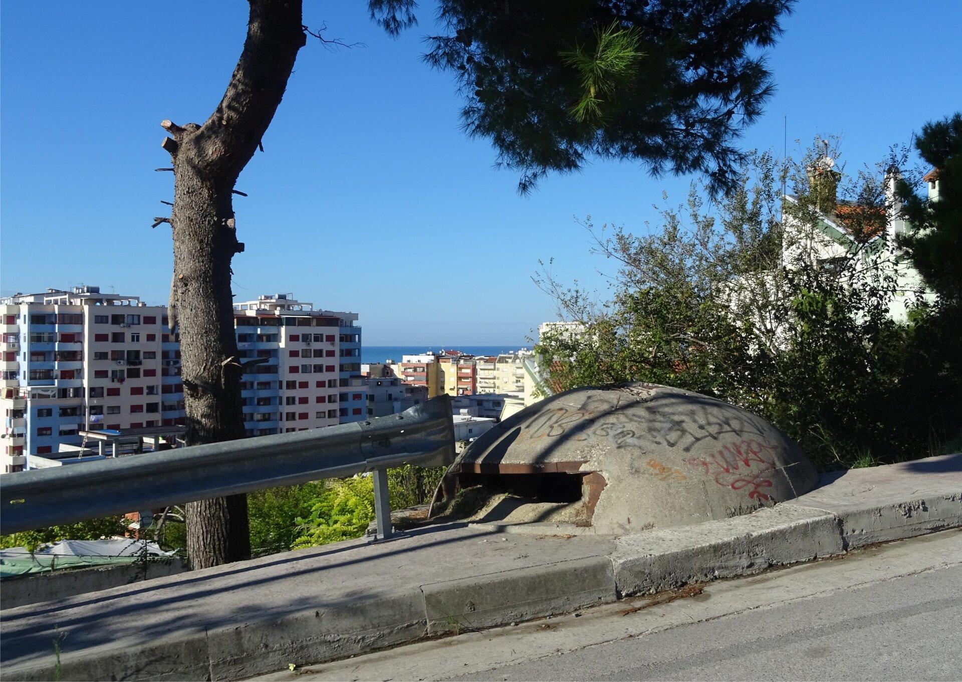 Albanien ist auch das Land der Bunker. Zwischen 170.000 und 200.000 Schutzbunker ließ hier der albanische Diktator Enver Hoxha in den 1970er- und 1980er Jahren bauen. Dieser traute weder dem Westen noch dem Osten und ließ aus Furcht vor einem Angriff das gesamte Staatsgebiet mit grauen Betonbauten überziehen. Überall im Land ragen sie wie Pilze aus dem Boden. Die Bunker stehen an den Küsten und auf den Gebirgspässen, in einsamen Tälern und entlang der Grenzen, im Inneren des Landes und in den Hinterhöfen der Hauptstadt. Jedoch nicht nur Schutzbunker, von denen jeweils einer für 4 „Normalalbaner“ vorgesehen war, gibt es in dem Land. Auch eine Vielzahl von MG- und Geschützständen sowie ein unterirdischer U-Boot Bunker wurden errichtet. Die kleine Insel Sazan baute man zu einem streng geheimen Militärstützpunkt aus und für den Diktator Hoxha stand in der Hauptstadt Tirana eine große Bunkeranlage zur Verfügung.