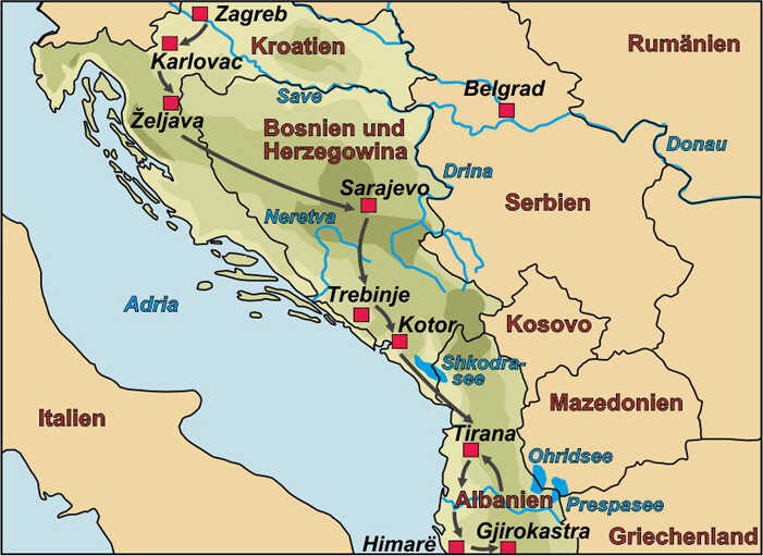 Begleiten Sie uns auf den Balkan und auf eine spannende Reise von Kroatien nach Bosnien-Herzegowina und Montenegro und weiter bis Albanien. Sie lernen die wechselvolle Geschichte von vier Ländern auf der Halbinsel im Süden Europas kennen.