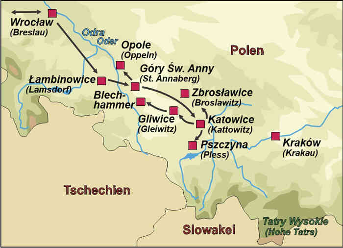 Stationen dieser abwechslungsreichen Reise sind Bunker der Oberschlesienstellung sowie polnische Anlagen an der einstigen Grenze, der Sendeturm von Gleiwitz, das ehemalige Kriegsgefangenenlager bei Lamsdorf, die Gedenkstätte am St. Annaberg sowie erhaltene Bunker der einstigen Oberschlesischen Hydrierwerke in Blechhammer.
