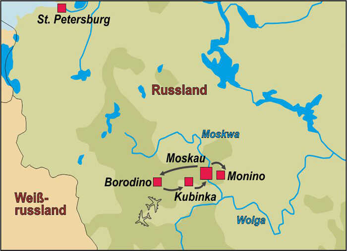 An diesen drei Tagen sind Sie in Borodino, Kubinka und im Park Patriont unterwegs.