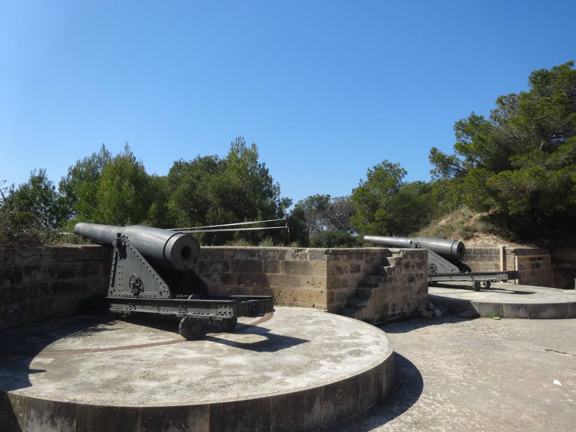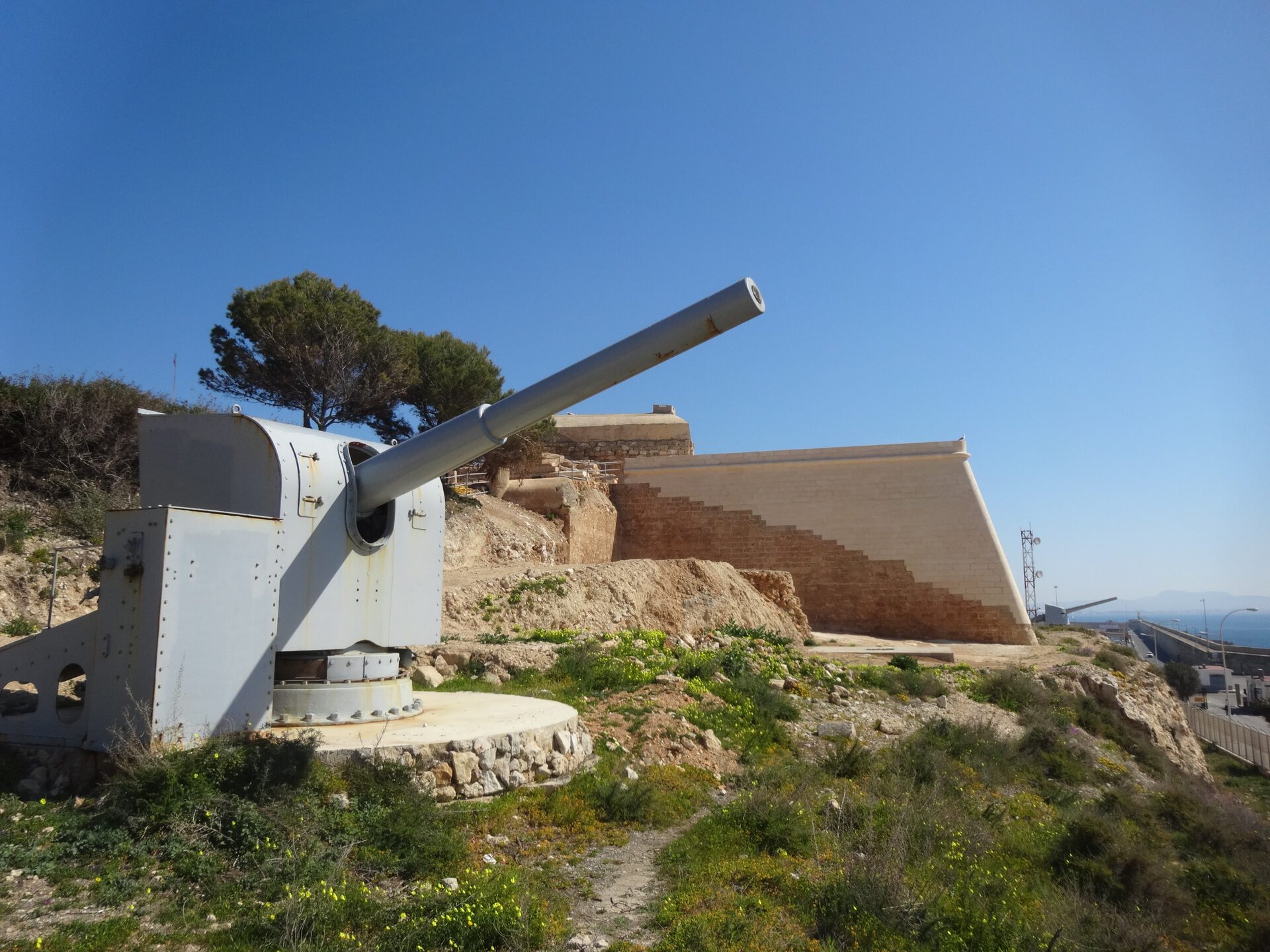 [0] => Am Kap Blanco wurde 1936 der Bau einer schweren Seezielbatterie geplant. Erst 1956 konnte die Batterie mit drei 30,5-cm-Vickers fertig gestellt werden. Gemeinsam mit den Geschützen anderer Batterien sollten mindestens neun 30,5-cm-Kanonen (12 inch) die Bucht von Palma sperren. Im Rahmen des sogenannten Plan Norte, der eine umfassende Neuordnung des spanischen Militärs nach Beendigung des Kalten Krieges umfasste, wurden viele der Küstenbatterien entwaffnet. Zwei der ehemals drei mächtigen Kanonen können Sie besichtigen.