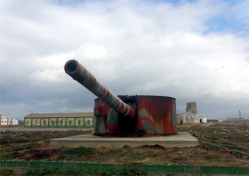 [0] => Fahrt zum Kap Punta de Tarifa, am südlichsten Punkt der iberischen Halbinsel und des europäischen Festlandes. Die 1937 errichteten Seezielbatterien sollten die Fahrt feindlicher Kriegsschiffe durch die Straße von Gibraltar verhindern. Sie erkunden zwei Batterien, die jeweils mit einem Zwillings-Geschützturm des Schlachtschiffes Jaime I. bewaffnet waren. Diese vier 30,5-cm Vickers-Geschütze hatten eine Reichweite von 21 Kilometern und konnten so die nur 14 Kilometer entfernt liegende afrikanische Küste erreichen. Beide Geschütztürme sind noch erhalten.