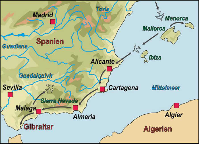 Diese spannende Geschichtsreise führt Sie auf die Balearen-Inseln Mallorca und Menorca sowie entlang der spanischen Küste zur Hafenstadt Cartagena sowie nach Tarifa an Spaniens südlichstem Punkt. Außerdem reisen Sie nach Gibraltar und erkunden die Festung mit ihren unterirdischen Tunnelsystemen. Sie besichtigen Küstenbatterien mit Fernkampfgeschützen und gehen in der Festung Gibraltar auf Erkundungstour.